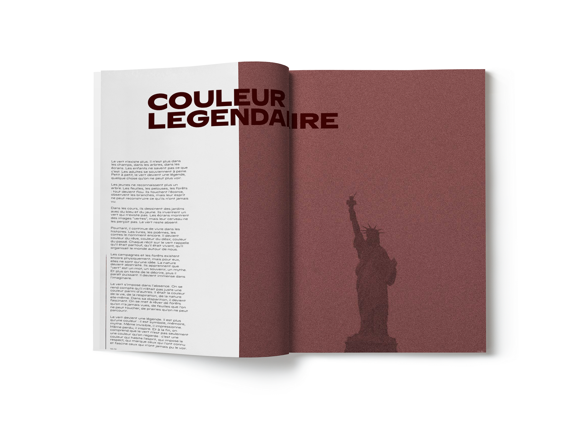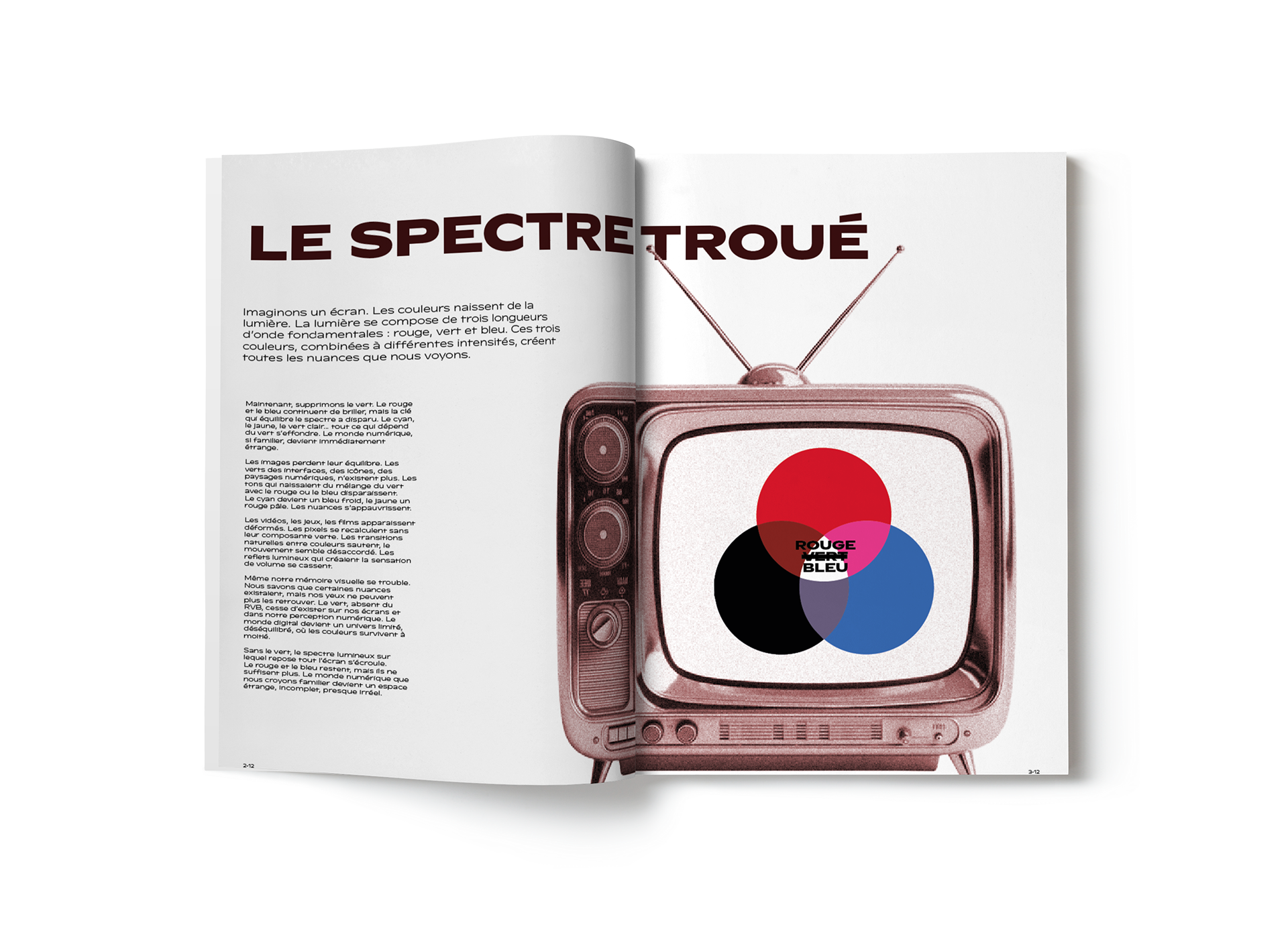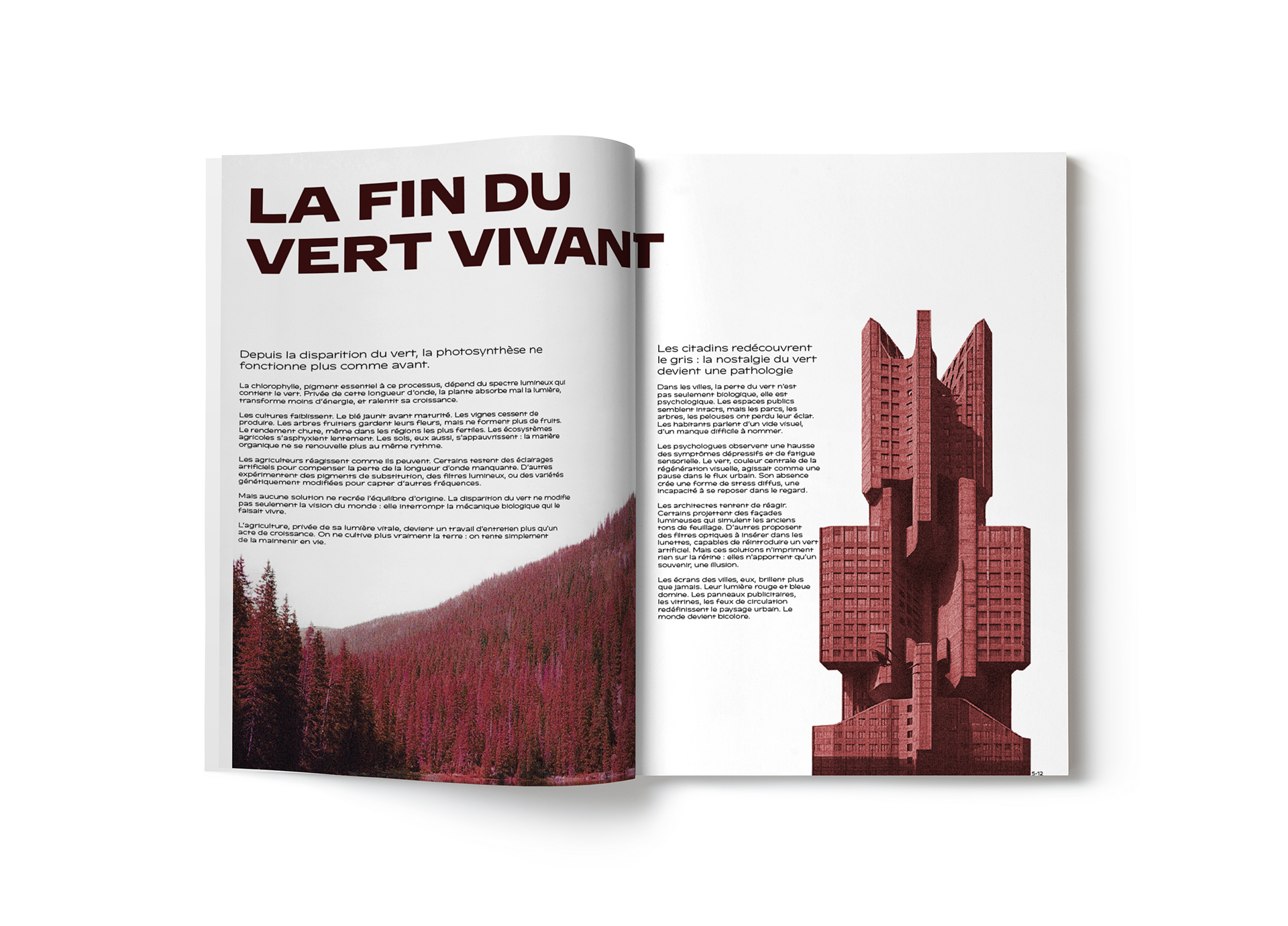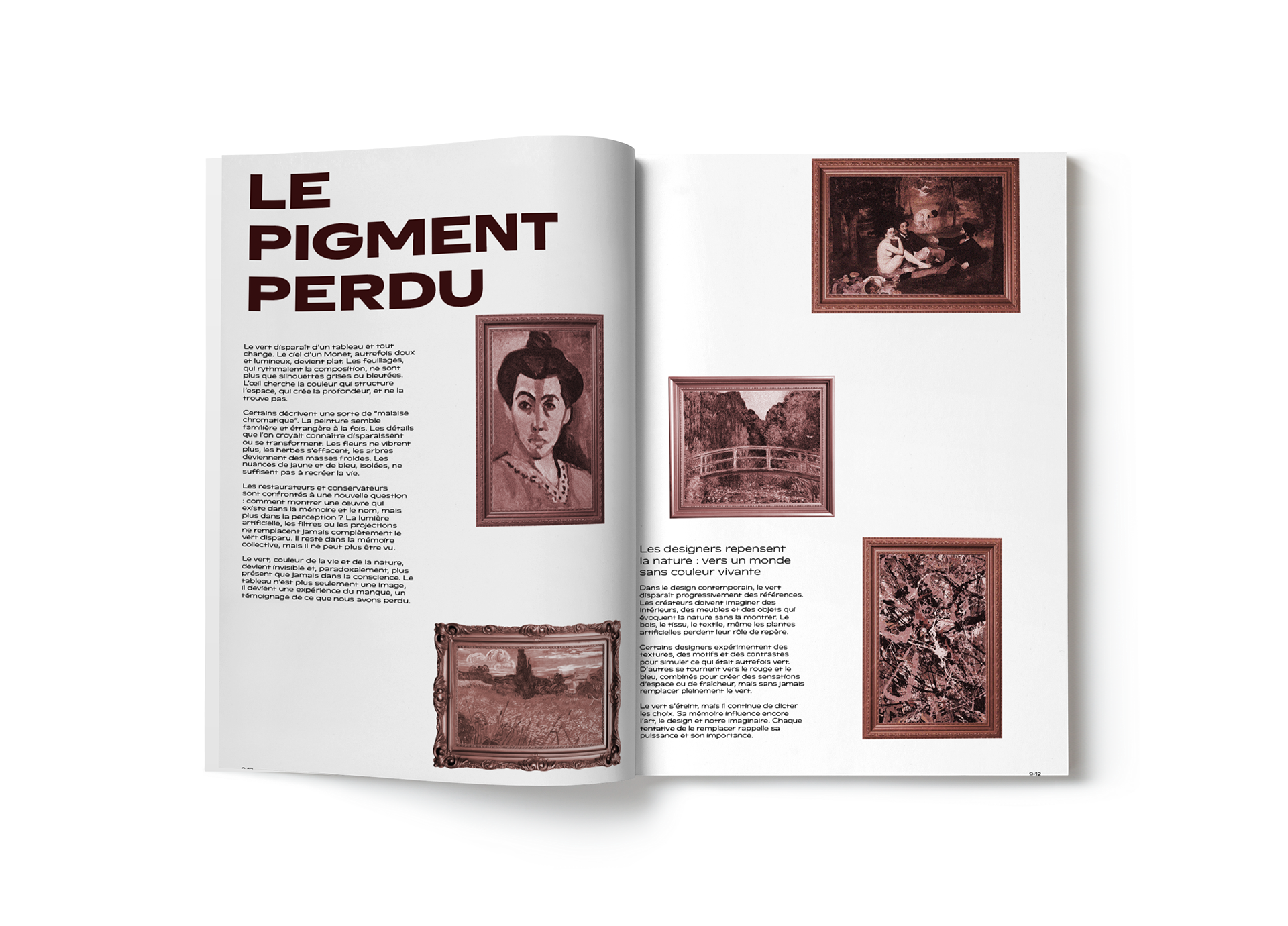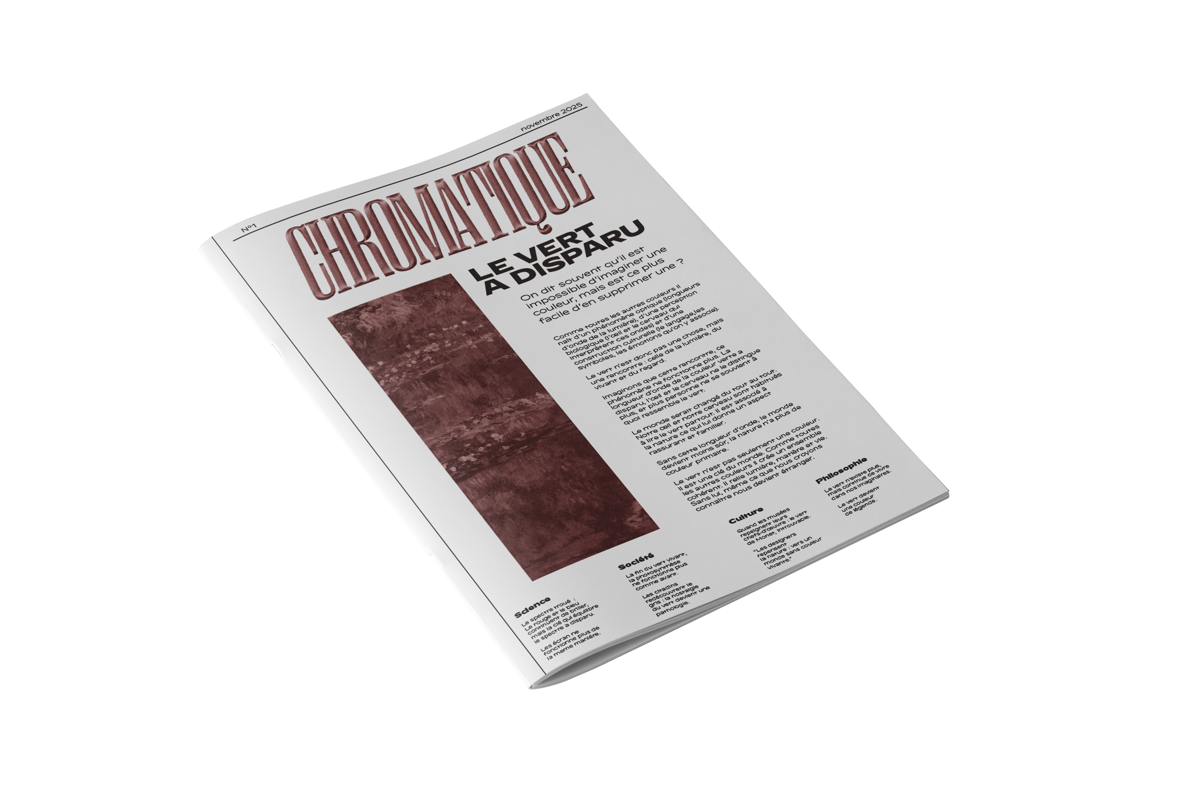 Chromatique est un journal fictif qui consacre chaque numéro à une couleur, explorée à travers plusieurs prismes comme l’économie, l’art, la culture ou l’histoire. Le premier numéro imagine la disparition totale du vert. J’y examine les conséquences sur la nature, les images numériques, les chefs-d’œuvre de la peinture et la mémoire collective. Le projet prend la forme d’une enquête sensible et dystopique, où le vert devient une couleur de légende que plus personne ne peut imaginer.